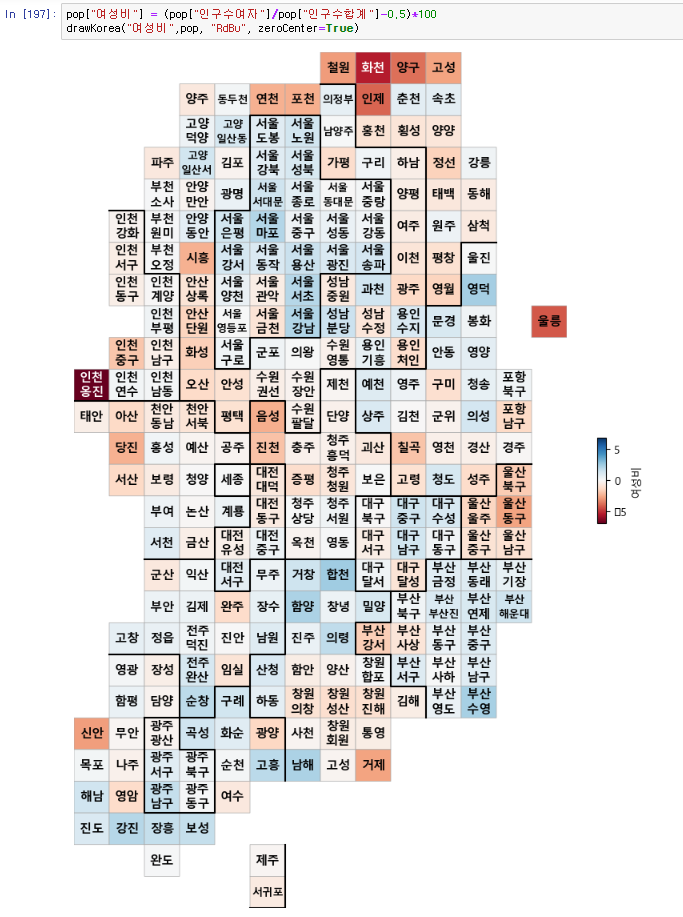 drawKorea("여성비",pop, "RdBu", zeroCenter=True)