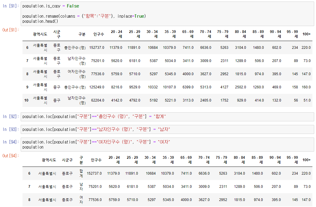 population.loc[population["구분"]=="여자인구수 (명)", "구분"] = "여자"