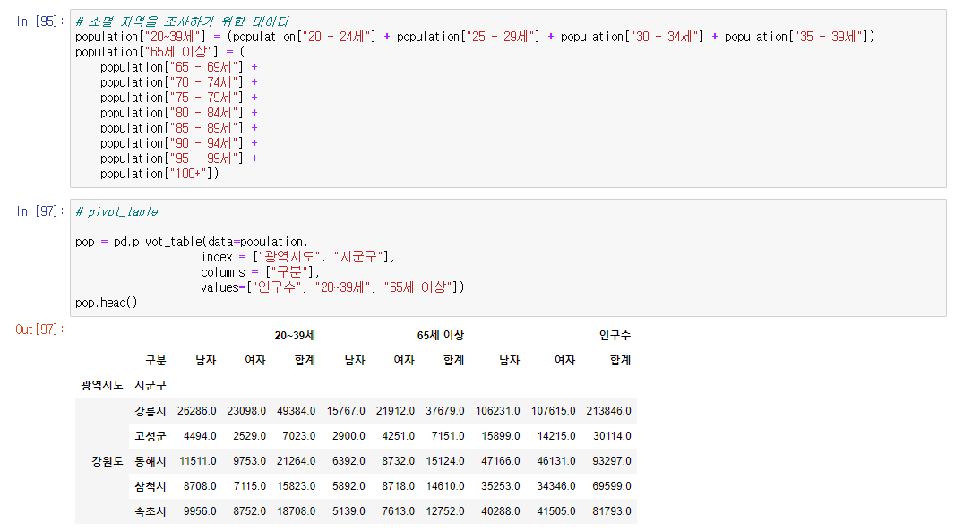 population["20~39세"] = (population["20 - 24세"] + population["25 - 29세"] + population["30 - 34세"] + population["35 - 39세"])