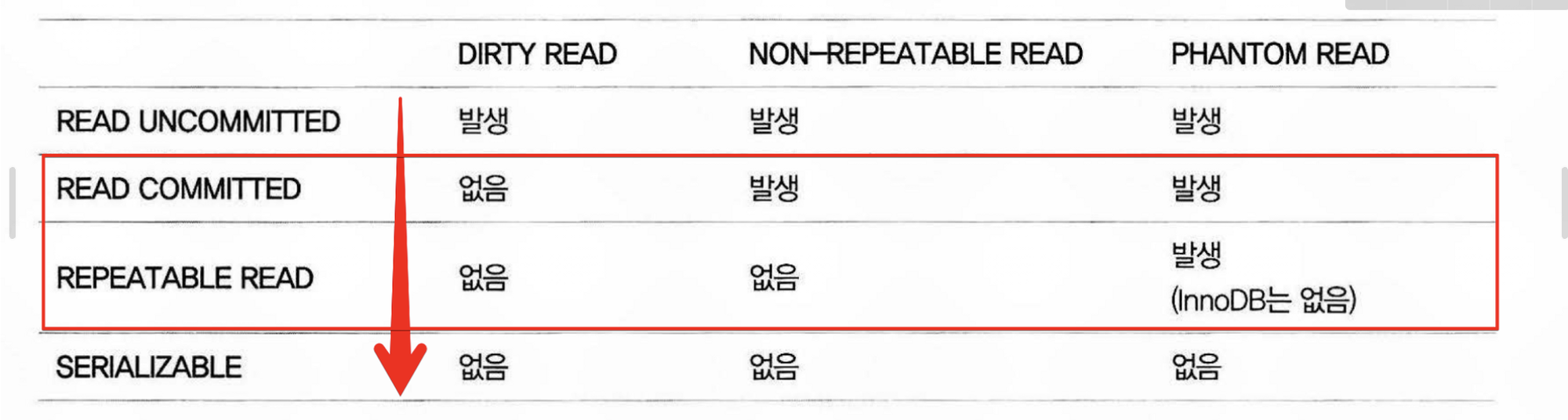 아래로 갈수록 격리 수준이 높아지고, 동시 처리 성능이 떨어진다.