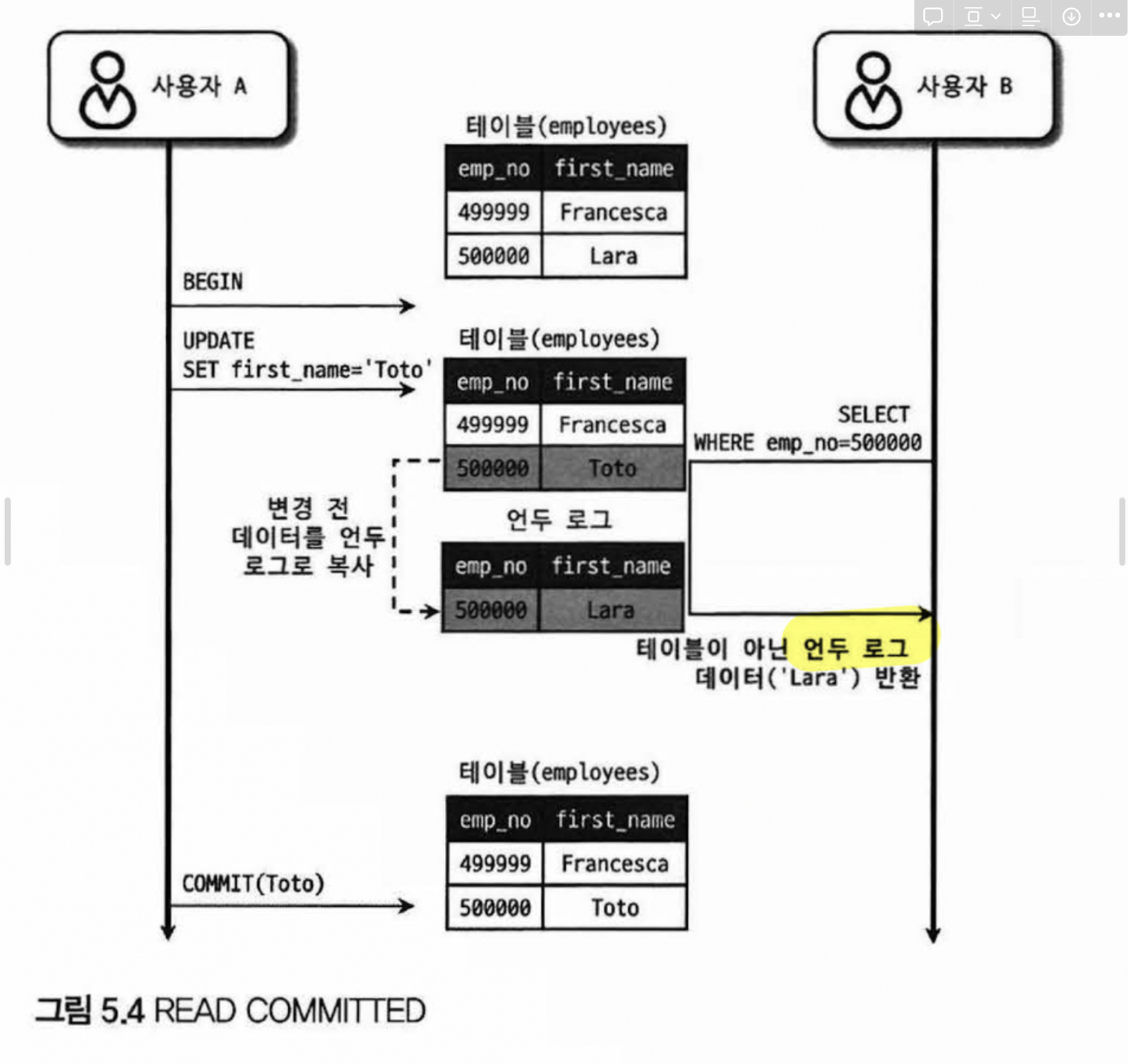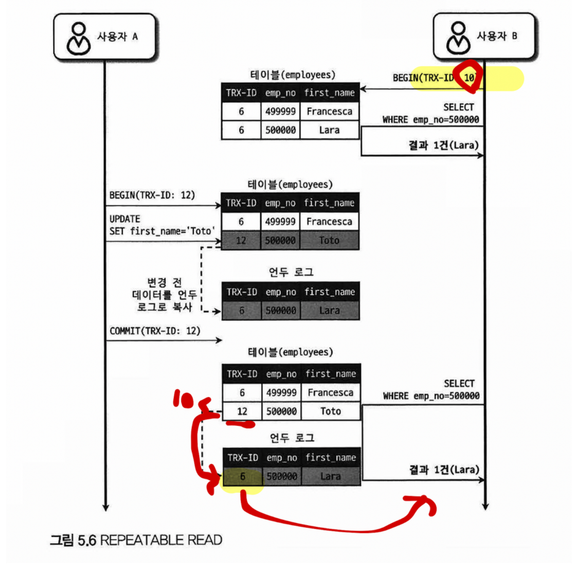 사용자 B의 트랜잭션 이후에 BEGIN 된 사용자 A의 COMMIT내용을 읽지 않고, 언두로그에 기록된 데이터를 대신 읽는다.