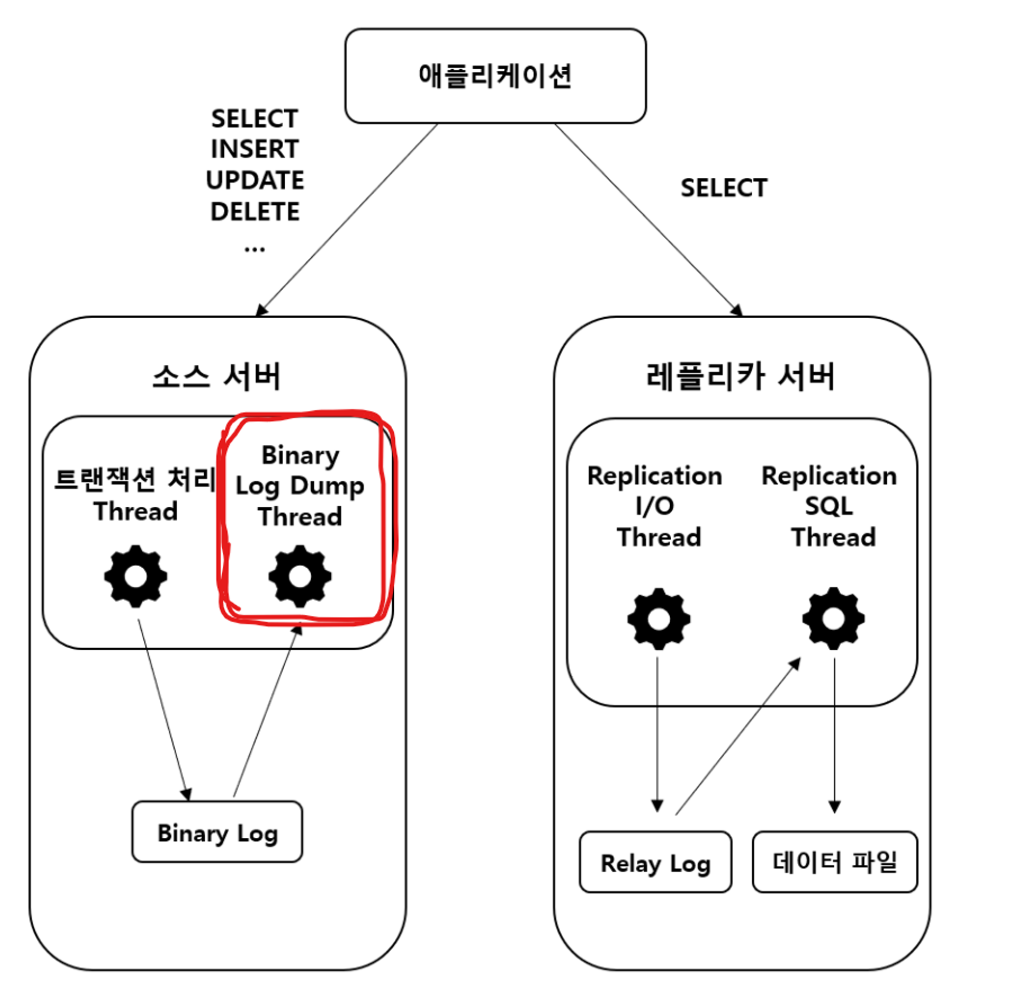 - Replication시 복제본 서버는 원본 서버의 바이너리 로그를 읽어들여 그 안에 기록된 SQL 문장들을 순서대로 재실행하여 Replication을 수행한다.