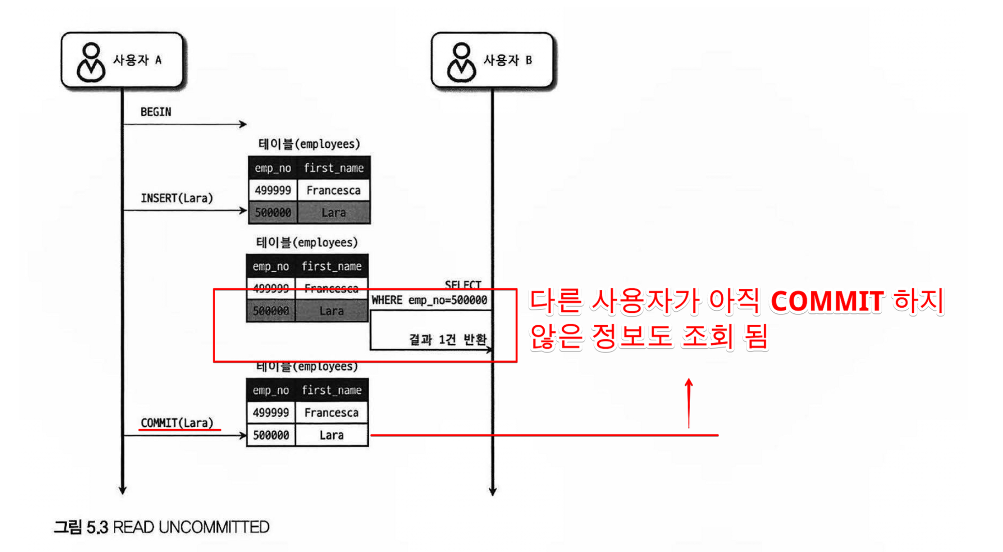 READ UNCOMMITED의 경우 RDBMS 표준에서 트랜잭션의 격리수준으로 인정하지 않을 정도로 정합성에 많은 문제가 있다.