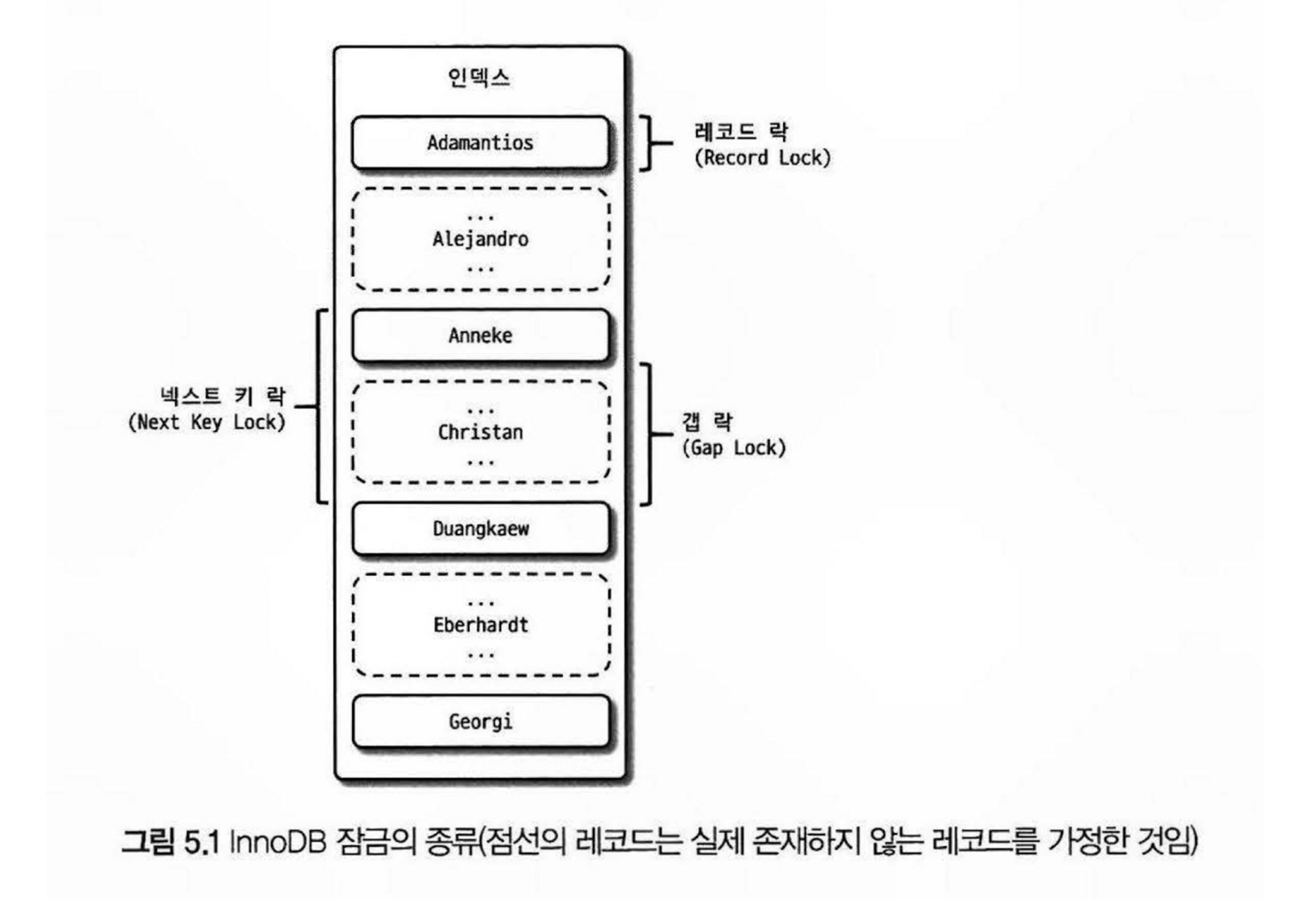 InnoDB의 잠금은 레코드가 아닌 인덱스를 잠그는 방식으로 처리, 즉 변경해야 할 레코드를 찾기 위해 검색한 인덱스의 레코드를 모두 락을 걸어야 한다.