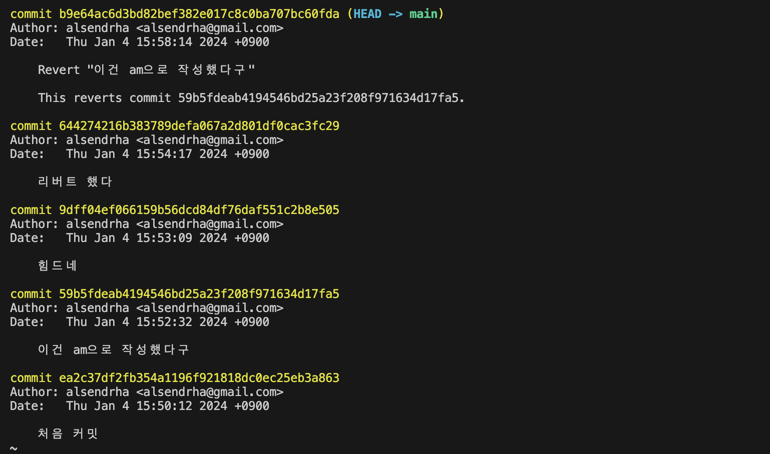 이동했다면 수정 후 git add . , git revert --continue -> :wq