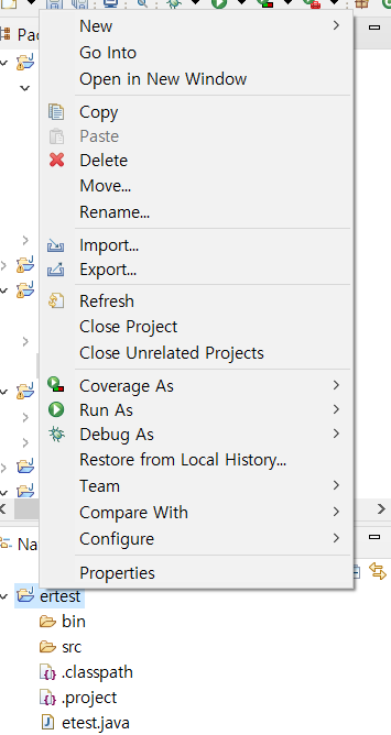 .class 파일은 bin폴더에 있다 왜 여기있는지 묻냐하면 위에서 설명한 원리랑 똑같다. ertest프로젝트 파일을 우클릭해 properties를 들어가면
