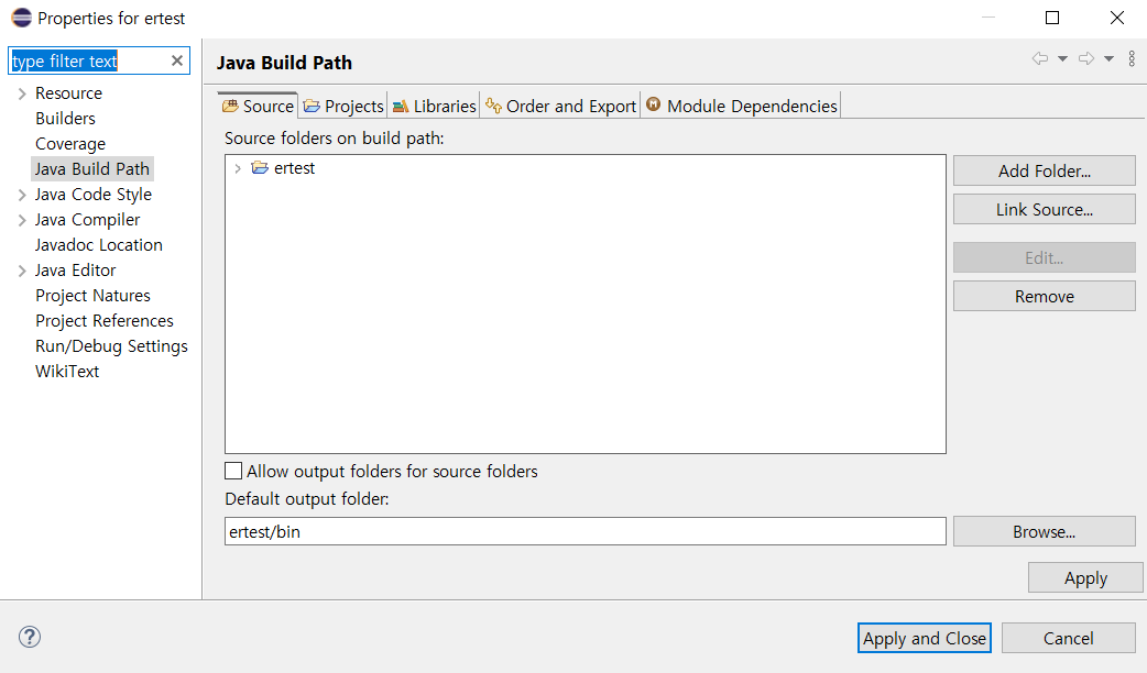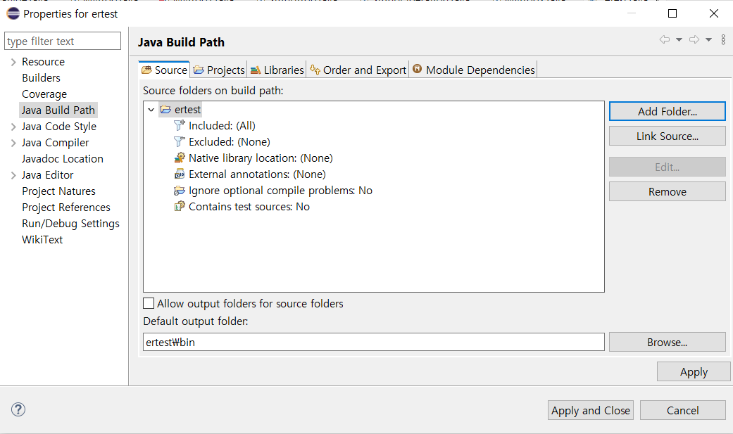 그 후 java build path > source 에 들어가면 위와 같이 ertest 프로젝트 폴더에 src파일이 build path로 설정돼있다.