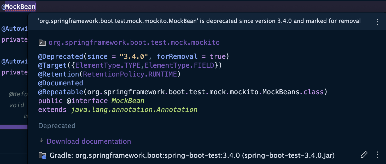 @MockBean 어노테이션은 version 3.4.0 에서 deprecated 되었다.