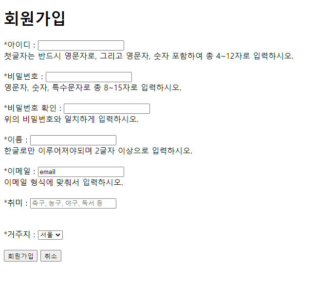 // 유효성 검사 : 아이디,비밀번호,비밀번호확인,이름
