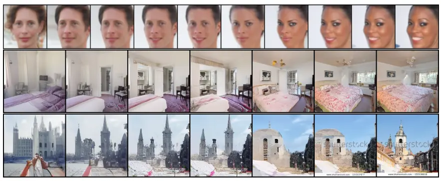 5.2.에 이어서, 서로 다른 두 를 섞으면 결과물 끼리 적당히 interpolation된 결과물이 나온다 (semantically meaningful interpolation)
