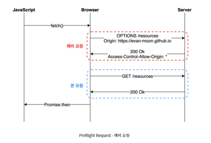 다음의 사진은 fetch API를 사용해 브라우저에게 리소스를 받아오라는 명령을 내리면, 브라우저는 서버에게 Preflight Request를 먼저 보내봅니다. 서버가 이 요청에 대한 응답으로 어떤 것을 허용하고 금지하는지를 정보로 응답 헤더에 담아 브라우저에게 다시 보내줍니다.