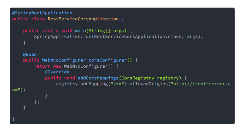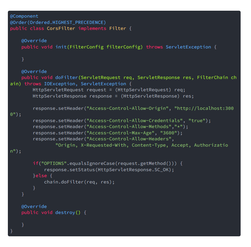 javax.servlet 의 Filter를 하나 생성하고 response 헤더에 Access-Control를 작성해주면 됩니다.