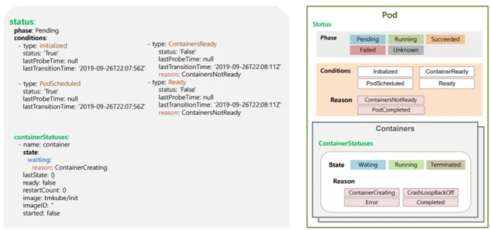 Condition속성을 통해 단계와 상태를 알 수 있다.- 파드 내 컨테이너들은 State, Reason 속성 값을 통해 각 컨테이너들의 대표적 상태를 제공