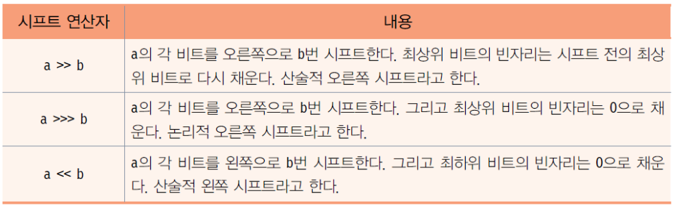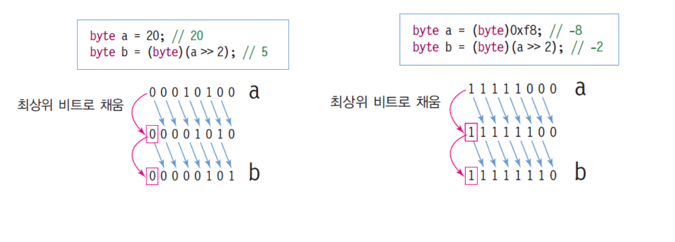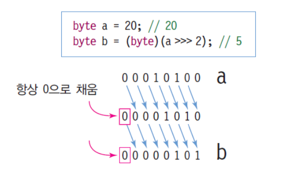 System.out.println(c >> 2); //c를 2비트 오른쪽 시프트. 0삽입(양수)