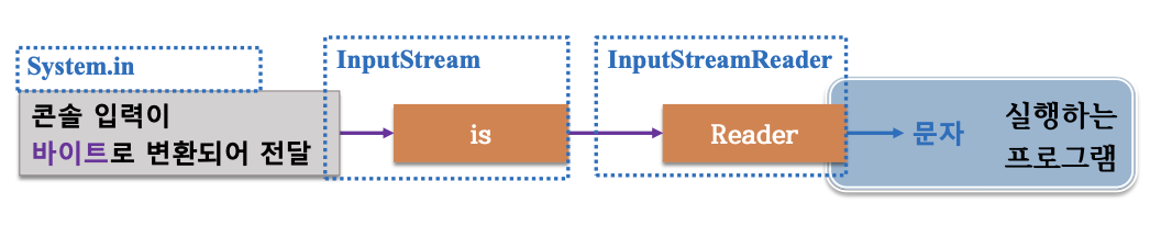 //'콘솔 입력 스트림'을 '문자 변환 보조 스트림' 인 InputStreamReader 에 연결하는 코드