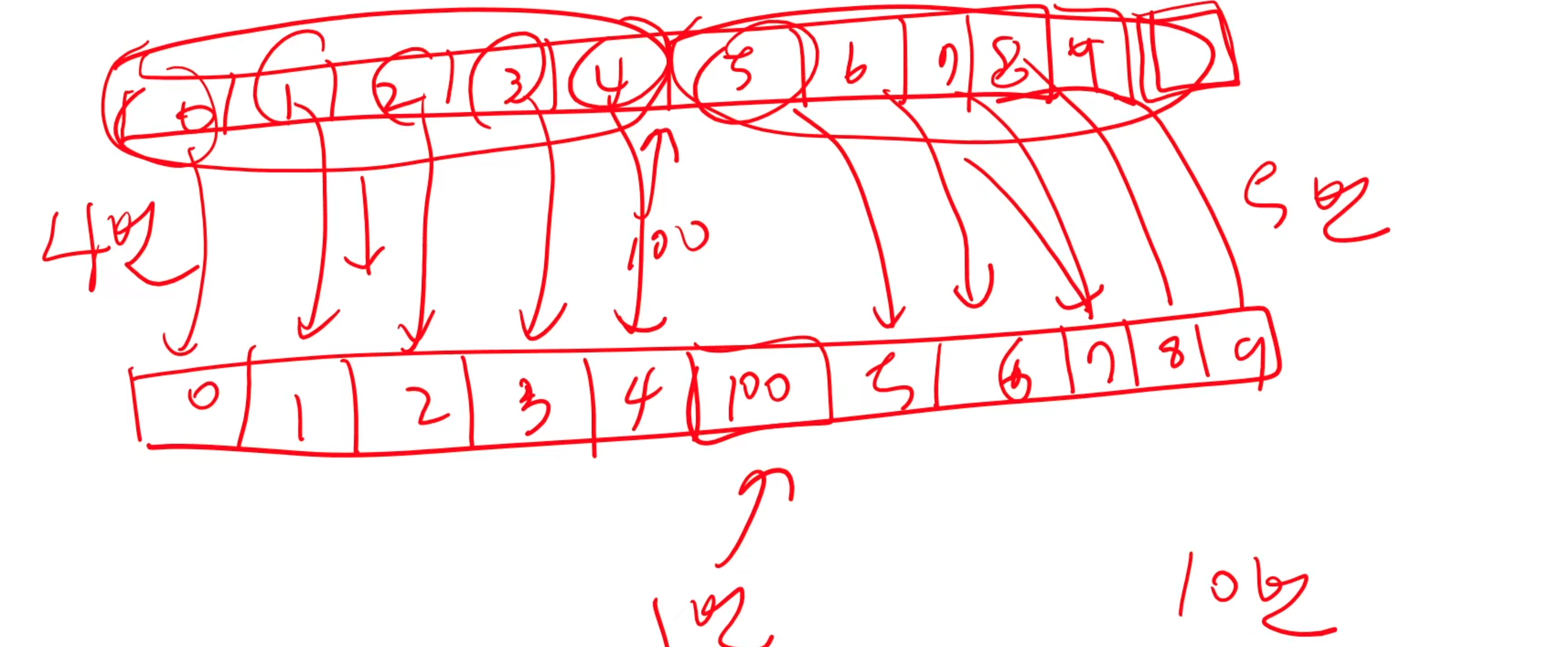 특정 요소를 추가하려면, 배열값마다 값 복사를 해줘야하기 때문에 아래 100을 넣으려고 하면 그 주위의 모든 값들을 하나씩 복사를 시켜주기 때문에 O(n)이다.