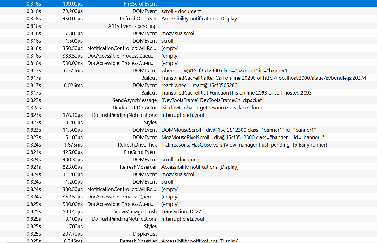 파이어폭스의 경우 크롬과 이벤트 네임이 너무 달라서 제대로 알아볼 수는 없지만... scroll 이벤트가 wheel 이벤트보다 먼저 발생하는 것을 확인할 수 있었다. 때문에 scroll 이벤트가 wheel 이벤트를 방해하지 않는 게 아닐까? 이벤트 네임을 검색해봐도 별다른 자료가 나오지 않아서 이 이상의 추론은 힘들다. 아무튼 해결했다. 전체적인 코드는 이쁘게 정리한 다음에 올리도록 하겠다.