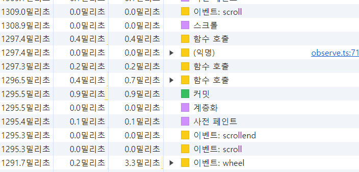 크롬 이벤트 로그를 확인해보았다. 이번에 새로 알게 된 사실인데 크롬은 smooth한 이동을 scroll 이벤트를 여러번 발생시키면서 구현한다. 문제는 마우스 휠을 눌러 wheel 이벤트를 발생시킬때 body의 스크롤이 막혀있지 않은 경우 wheel 이벤트가 발생 후 바로 scroll 이벤트가 발생하게 된다는 것이다. 이 5ms후 발생한 scroll 이벤트는 scrollIntoView가 발생시킨 scroll 이벤트를 끊어버리고!(scrollend 이벤트) 동작한다. 그러니 제대로 동작할 리가 없지.