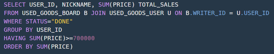 70๋ง์ ์ด์์ ์กฐ๊ฑด์ WHERE์ ์ ๊ฑธ์๋๋ฐ ์๊พธ ์ค๋ต์ด ๋์์ ๊ฒฐ๊ตญ ์ง๋ฌธํ๊ธฐ๋ฅผ ๋ดค๋ค. ์ ๋ต์ USER_ID๋ก GROUP BY๋ฅผ ํ๊ณ HAVING์ ์ ์กฐ๊ฑด์ ๊ฑฐ๋ ๊ฒ์ด์๋ค.