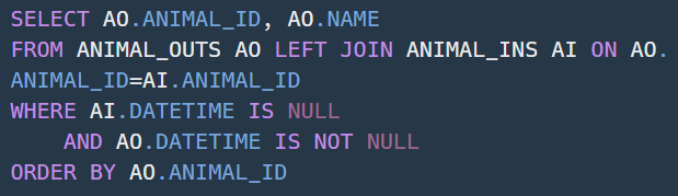 ANIMAL_OUTS 테이블을 기준으로 LEFT JOIN을 해야 ANIMAL_INS에 없는 ANIMAL_ID가 어떤건지 확인이 가능하다.