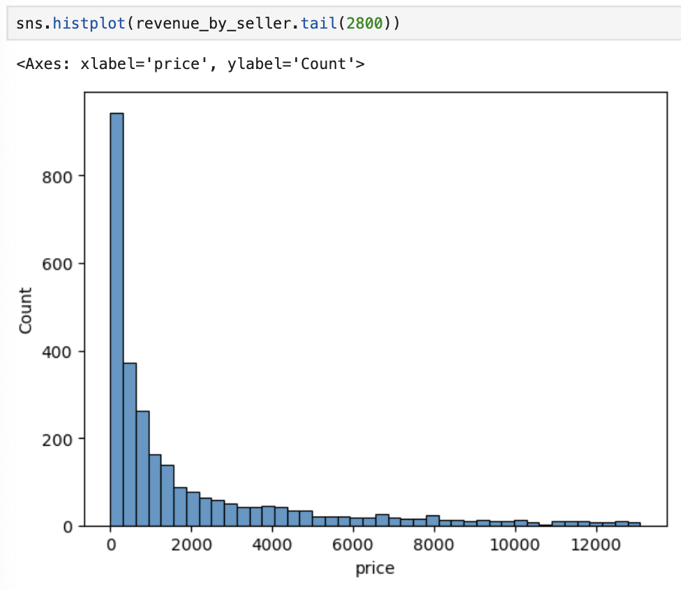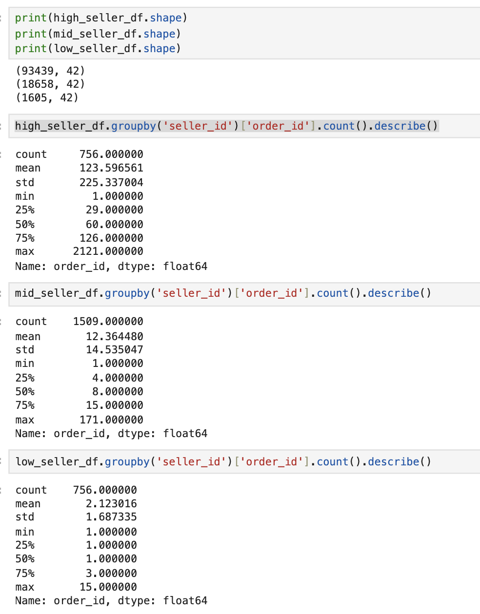 high_seller는 최대 주문건수가 2121건인데, low_seller는 최대가 고작 15건이다.