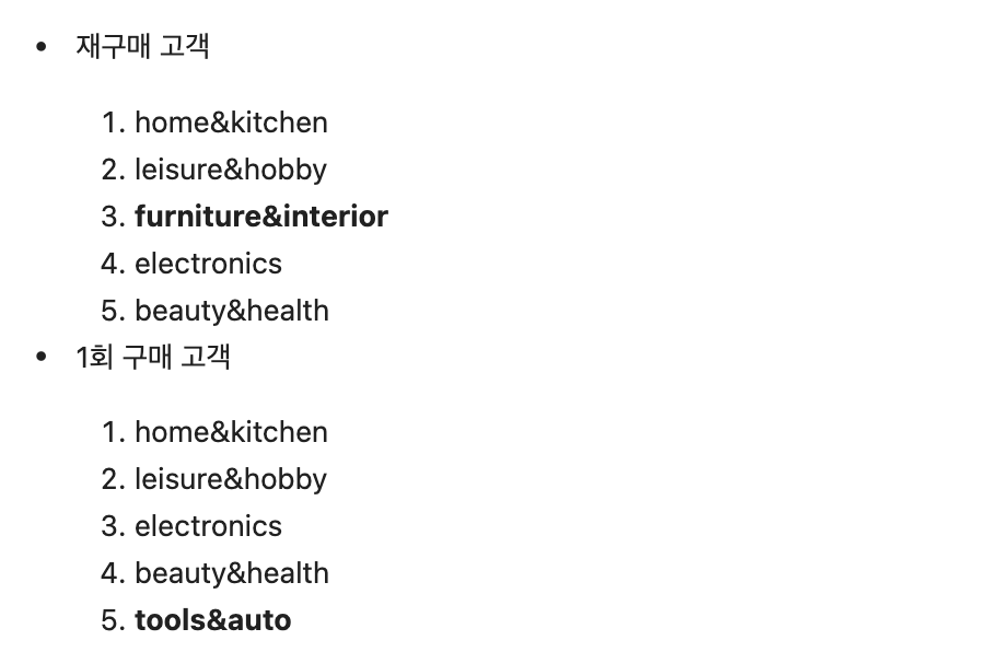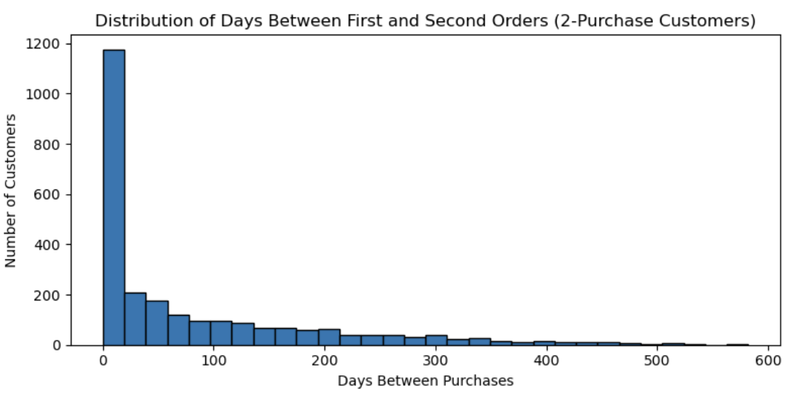 - 대부분의 재구매 고객은 첫 구매 후 한달 정도 내에 재구매가 이루어지며, 그 이후에는 이탈하는 패턴을 보임