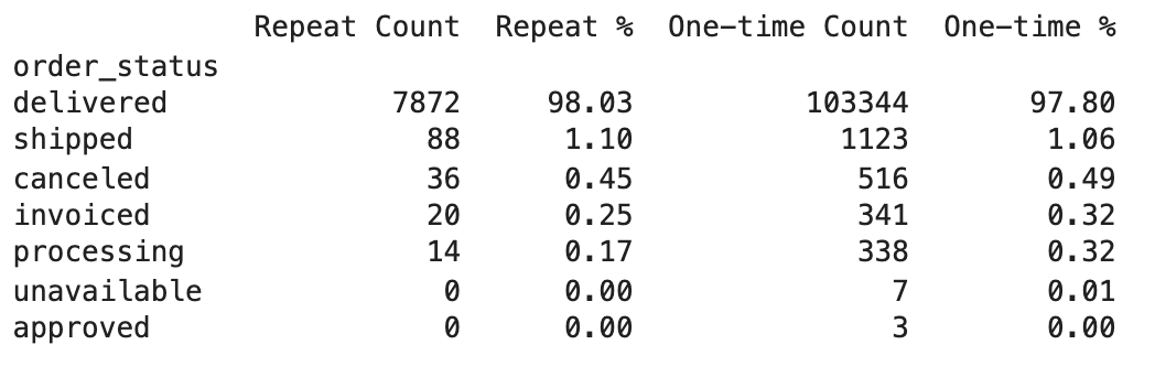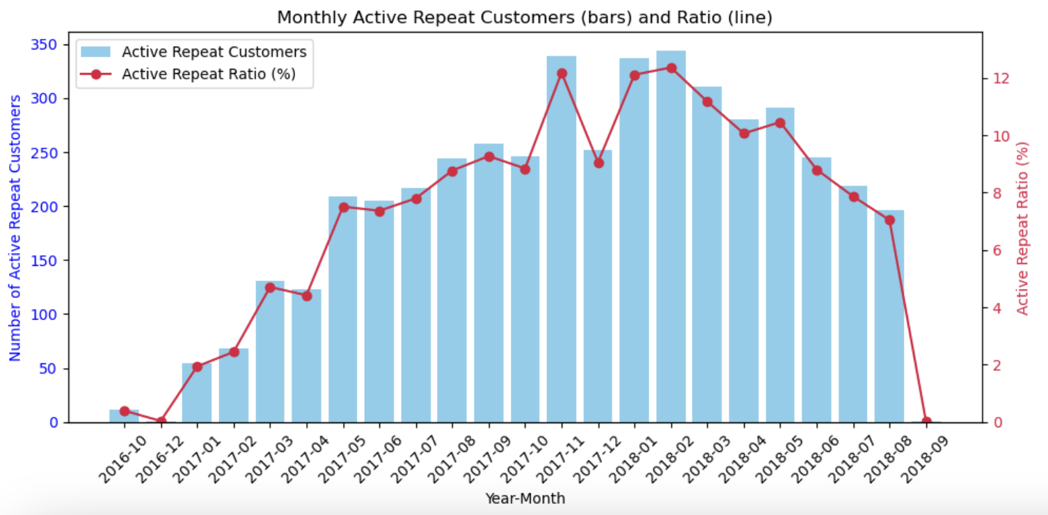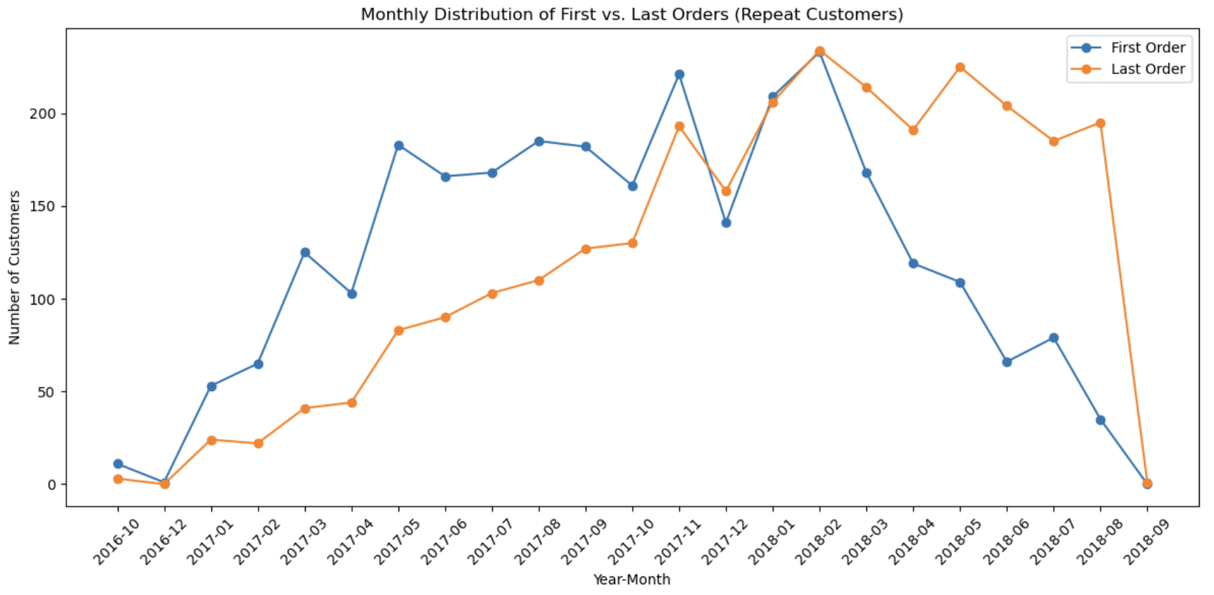 2018년 9월 이후의 데이터는 없기 때문에 뒤로 갈수록 첫 주문 고객은 감소하고, 마지막 주문 고객은 증가하는 것처럼 보일 수 있음