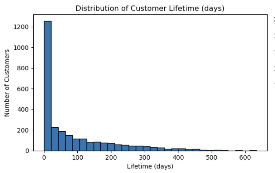 - 평균 생애 기간이 짧은데, 이는 첫 재구매 후 2~3차 구매로 끝나는 고객이 많다는 것을 의미