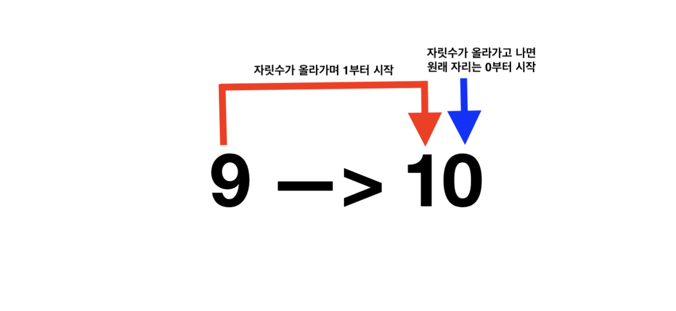 - 10진법에서 9에서 1이 더해져 10이 되는 과정은 아래와 같습니다.