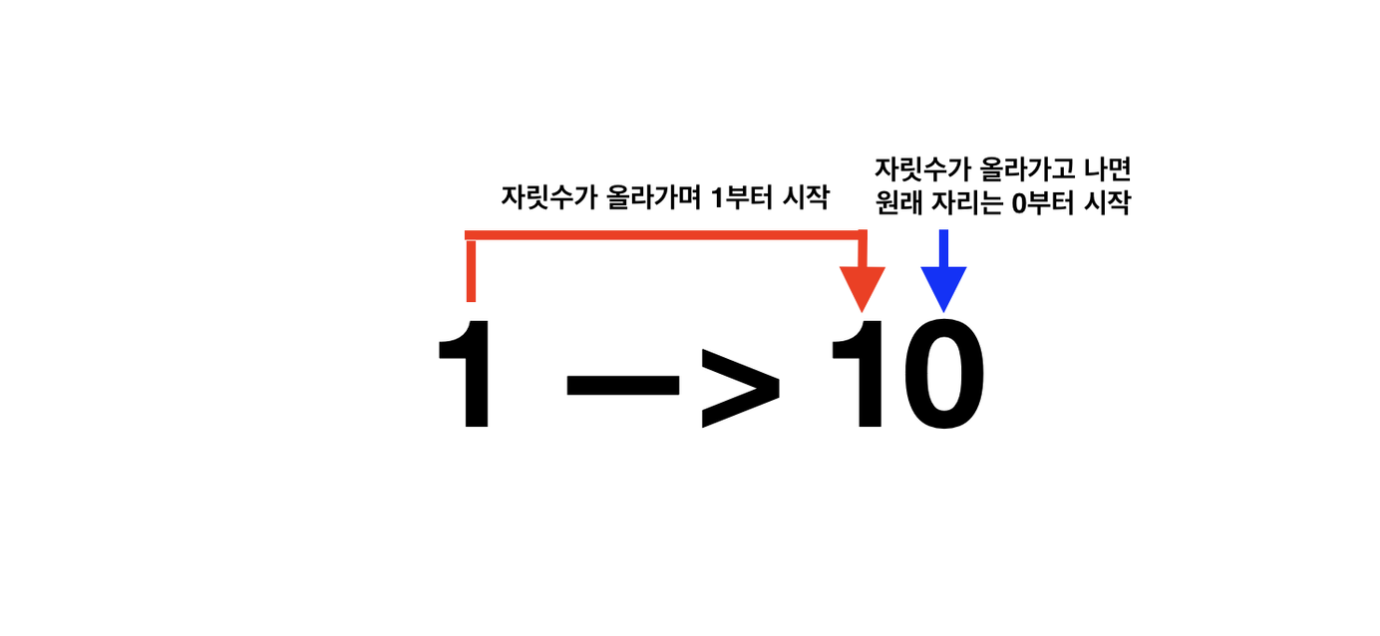 - 한 자리에 수가 끝(9)까지 차면 자릿수가 올라가여 올라간 자릿수는 1부터 다시 시작하고 원래 자릿수는 0이 되는 것이죠