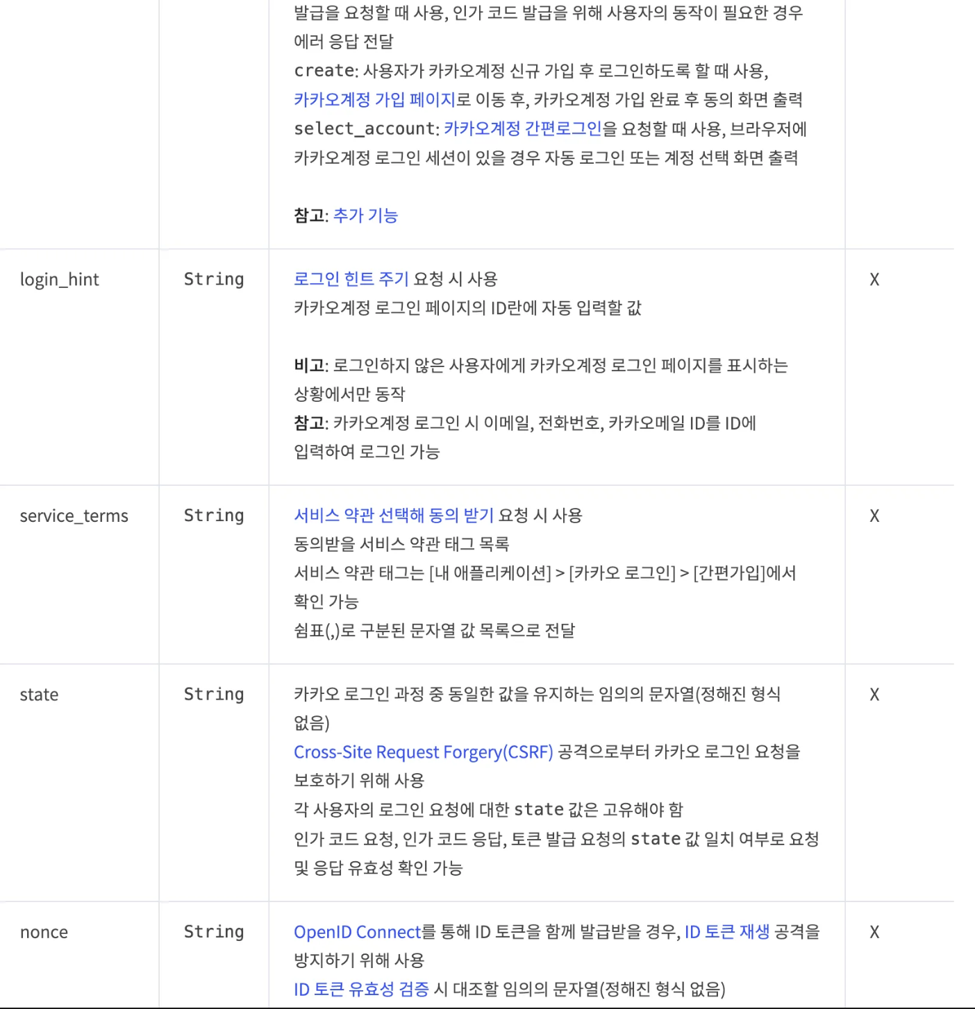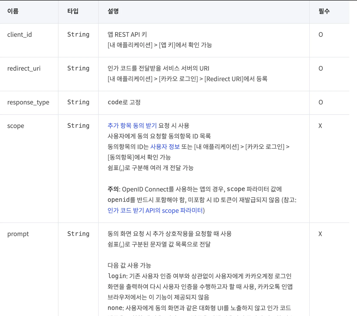 - Kakao Developers의 카카오 로그인 공식 문서에 인가 코드에 대한 설명이 자세히 되어있지는 않지만 “사용자가 인가를 완료하면, 서비스는 토큰 발급용 인가 코드를 전달받습니다.”라고 적혀있는걸 보면 인가 코드는 단순히 액세스 토큰을 발급하기 위한 용도인것을 유추해볼 수 있습니다.
