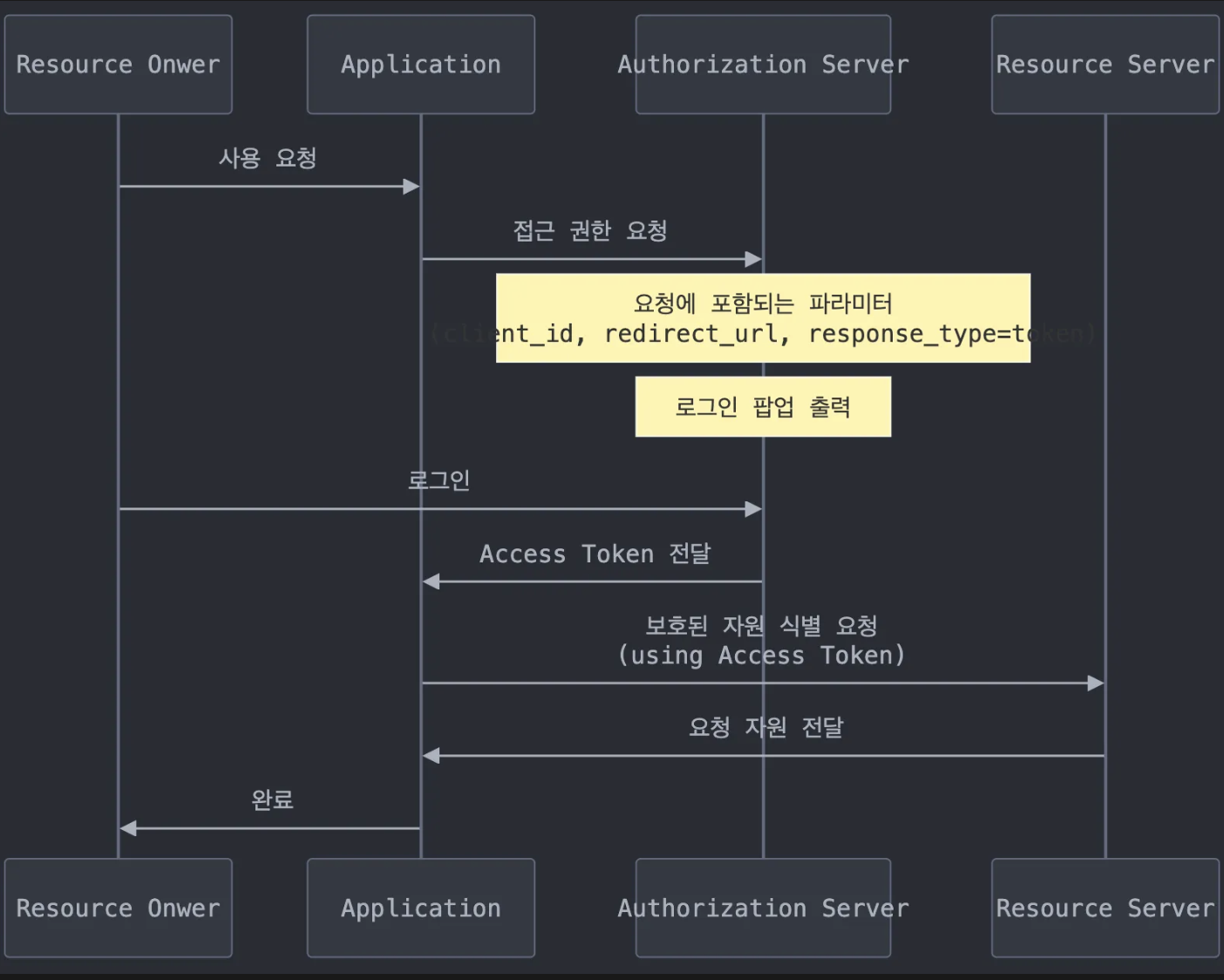 - 클라이언트 자격 증명을 안전하게 저장하기 어려운 환경(예: 자바스크립트 기반의 SPA 등)에서 사용되는 방식입니다. 인가 코드를 거치지 않고, 바로 액세스 토큰이 발급됩니다.