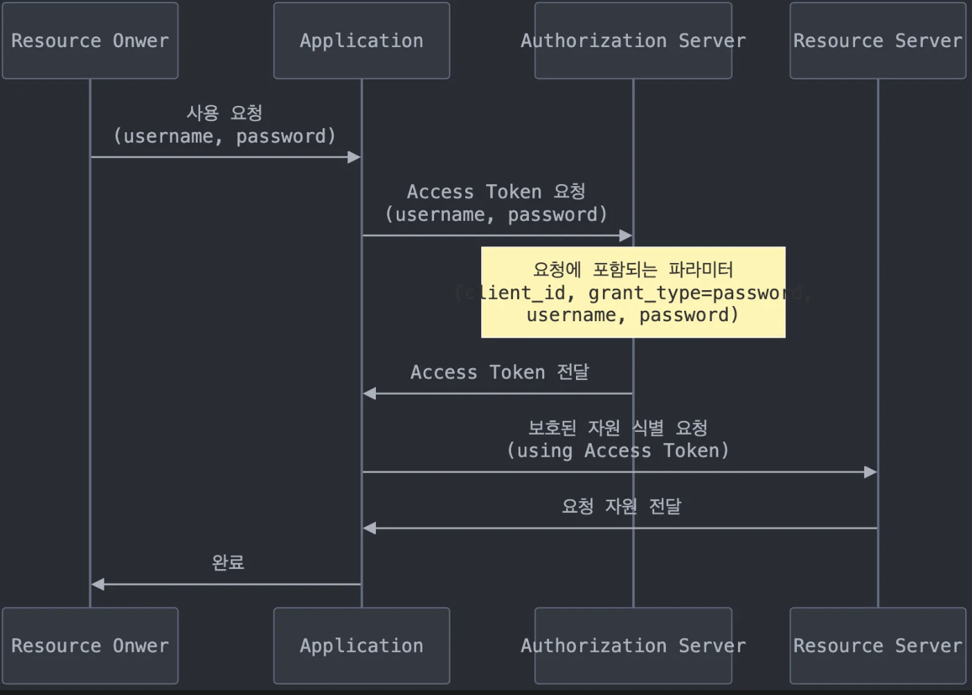 - 사용자 이름과 비밀번호를 직접 사용하여 액세스 토큰을 발급받는 방식입니다. 신뢰할 수 있는 클라이언트와 자원 서버가 같은 시스템에서 동작하는 경우에만 사용됩니다.