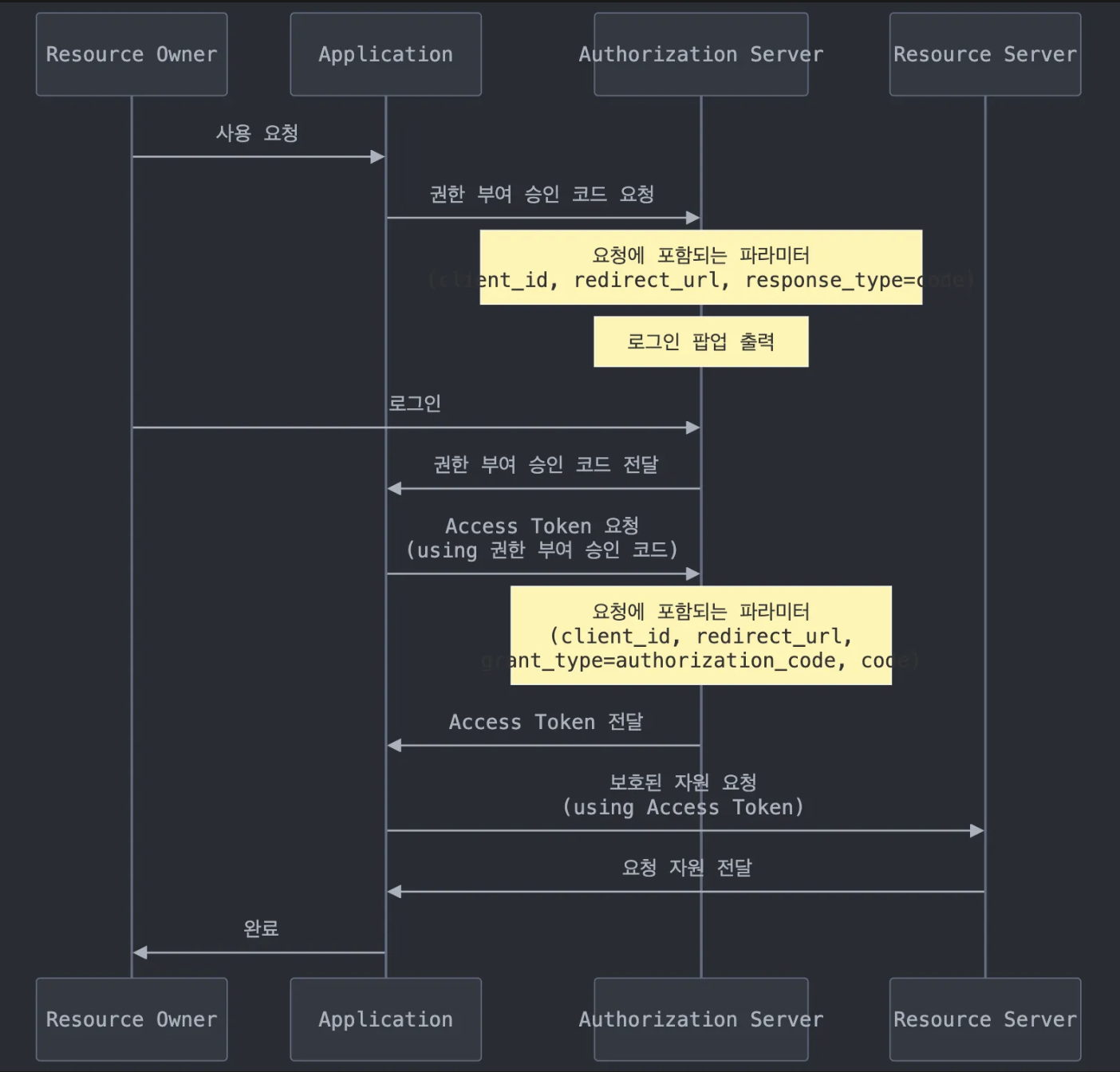 - 클라이언트는 사용자에게 인가 요청을 보내고, 사용자는 권한 서버에서 로그인 및 권한 승인을 완료합니다.
