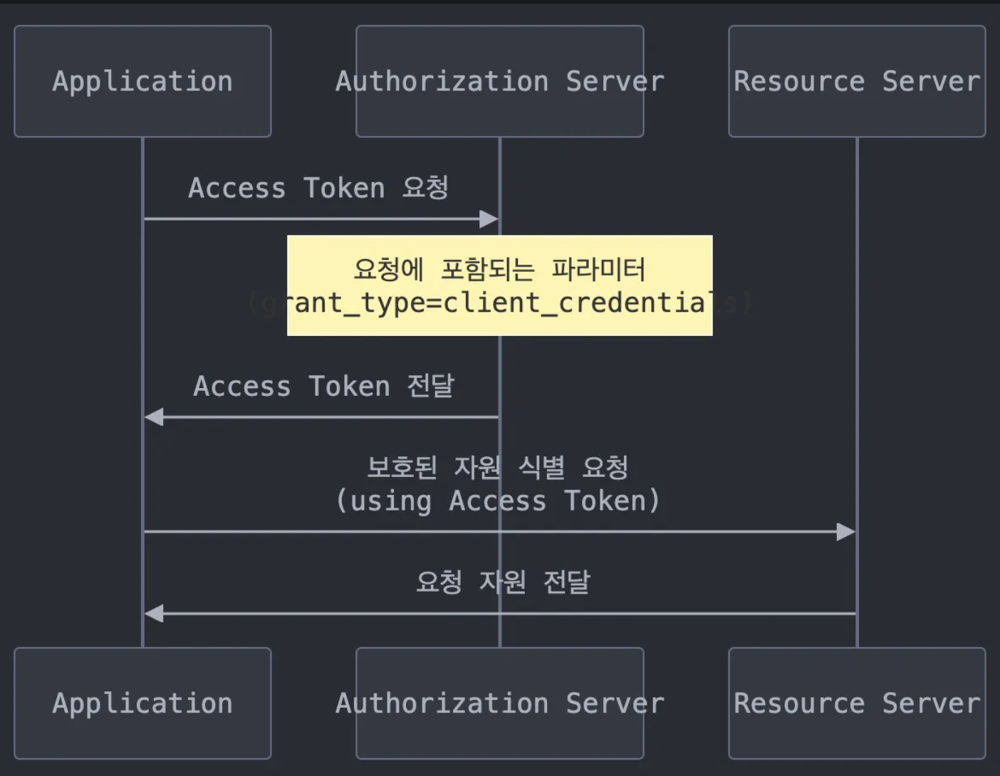 - 주요 특징: 클라이언트의 자격 증명만으로 액세스 토큰을 발급받는 방식입니다. 이 방식은 주로 클라이언트가 직접 자신이 소유한 리소스에 접근할 때 사용됩니다.