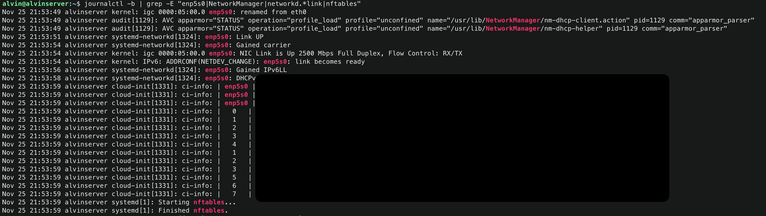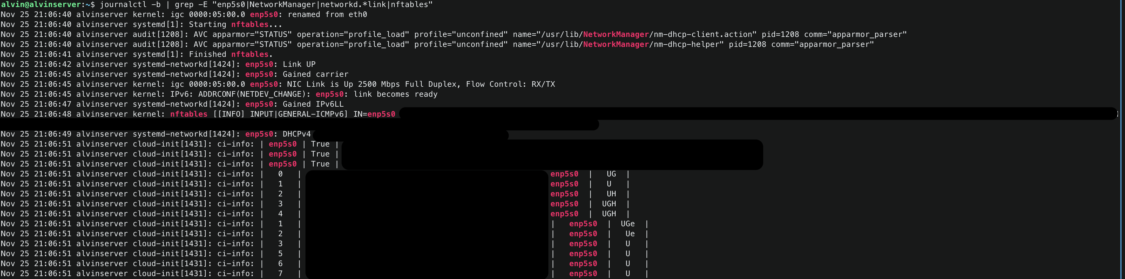 alvin@alvinserver:~$ journalctl -b | grep -E "enp5s0|NetworkManager|networkd.*link|nftables"