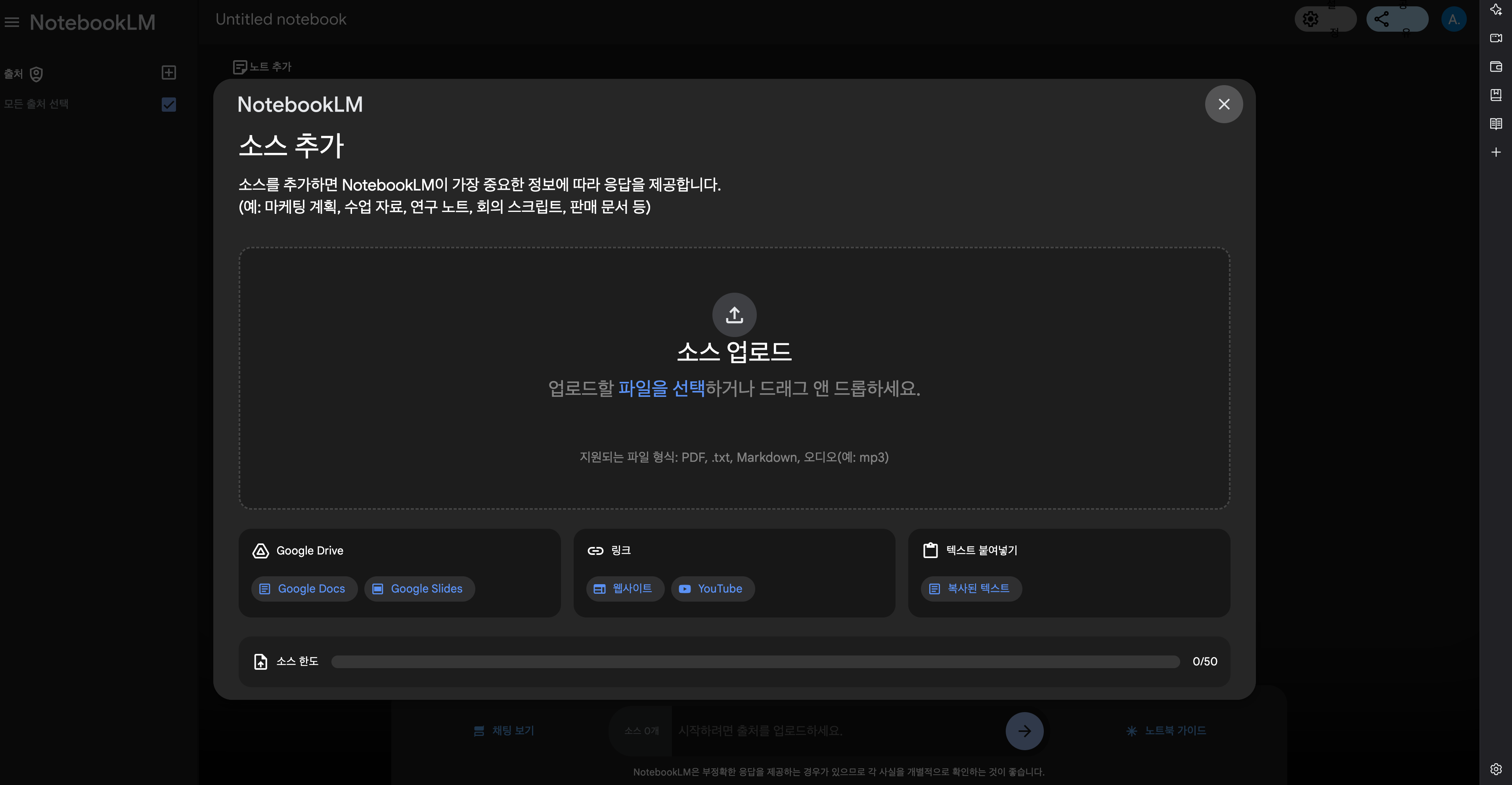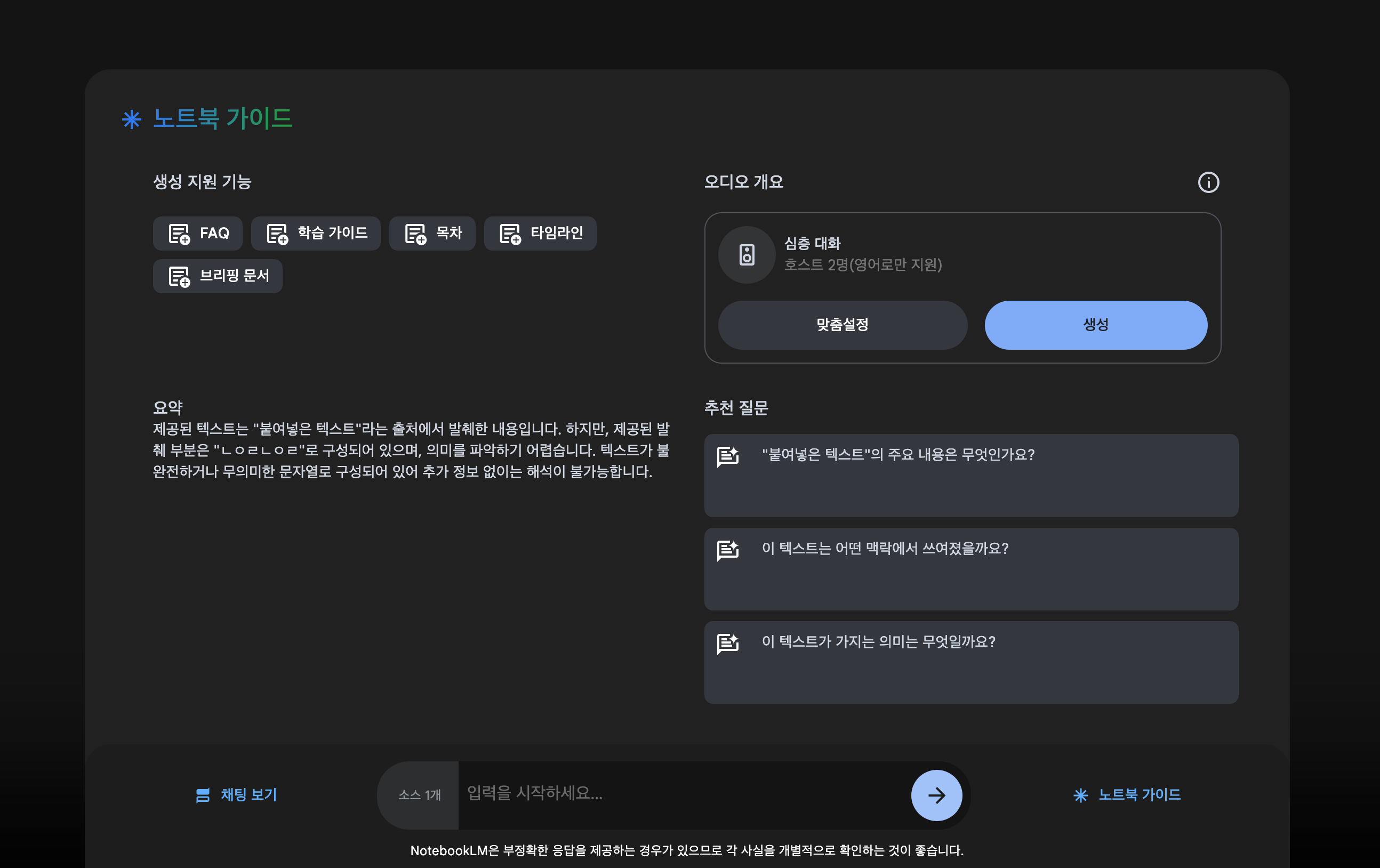 소스 업로드 페이지에서 유튜브 링크든 PDF든 마크다운이든 원하는 형식으로 넣으면 된다. 나는 그냥 텍스트로 된 내용을 복사해서 붙여넣기 했다.