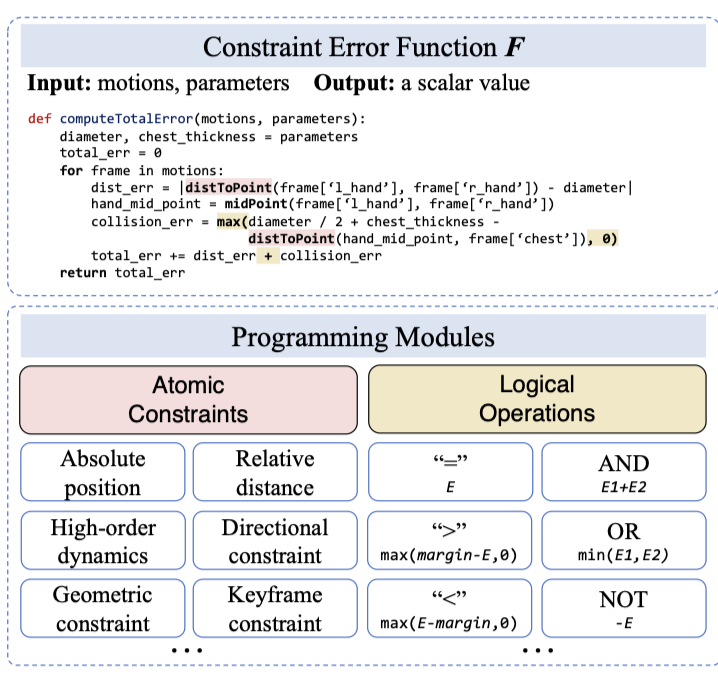 위 그림은, 해당 프레임워크의 Atomic Constraints와 Logical Operations를 보여주는데, 저것을 기반으로 LLM이 Constrainst에 대한 Error function을 짠다고 생각하면 된다.