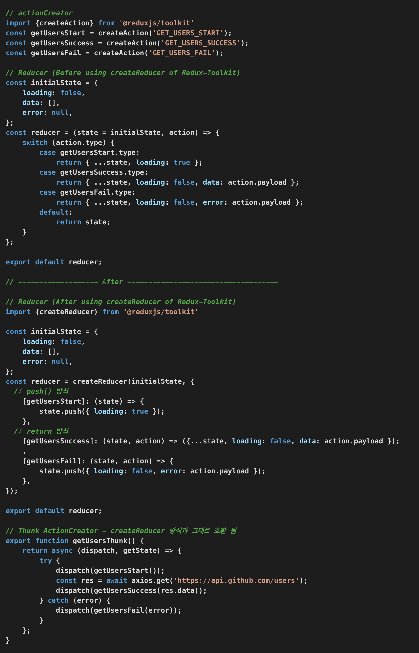 뿐만 아니라 default 를 항상 명시해 주었는데 이러한 귀찮은 것들을 createReducer 를 사용하면 해결할 수 있다.