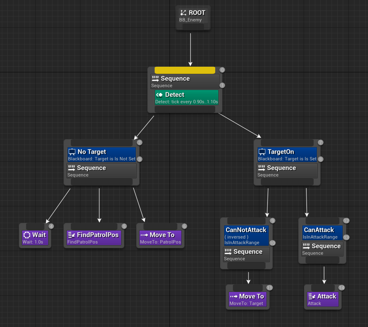 이후 왼쪽에 있는 Sequence노드가 실행된다. 해당 노드는 Target을 찾을 수 없을 때 True값을 반환하며, 아래 연결된 노드들을 실행하고 다시 Root노드로 돌아간다.