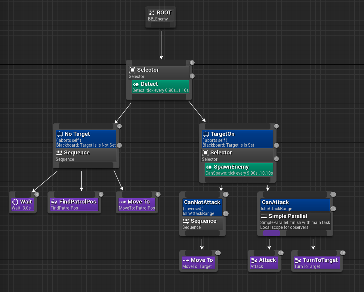 Target을 발견한 이후, Enemy와의 전투가 시작되면 Service노드가 실행되도록 Tree를 구성하였다.