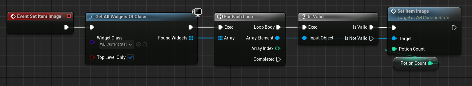 이는 예를 들어 아이템을 먹는 경우, 위젯에 실시간으로 정보가 바뀌어야 한다면 에디터 내에서 위 함수가 호출될 시에 Get All Widgets of Class 등을 통해 위젯를 찾아 정보를 바꾸기에 용이하다.