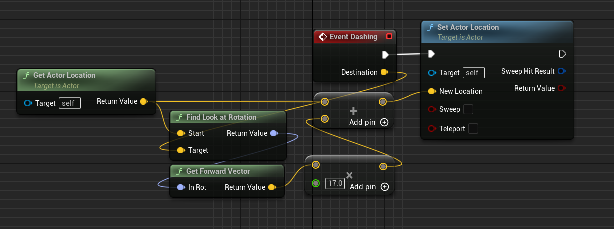 Dash에는 다양한 애니메이션이 있고, 자체적으로 Root Motion이 있는 애니메이션도 있겠지만 현재 개발하고자 하는 것은 날아서 Dash를 하는 애니메이션이며 Root Motion은 없기에 직접 Actor를 움직여야 한다.