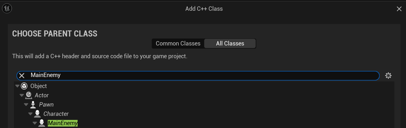 CPP 파일을 생성할 때, 부모클래스를 MainEnemy로 지정한다.