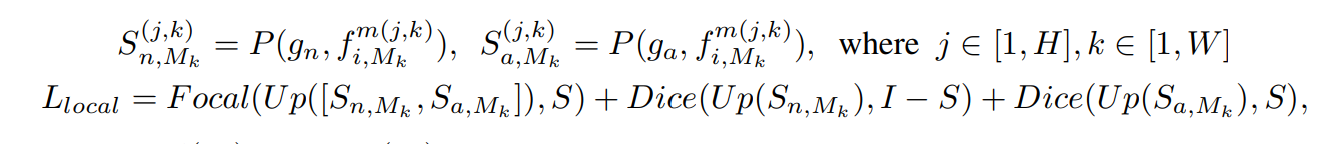 여기서 Focal과 Dice는 focal loss, Dice loss이다. 이상 영역은 일반적으로 정상 영역보다 작기 때문에 불균형 문제를 해결하기 위해 Focal 로스를 사용한다. 또한 모델이 decision boundary를 정확히 설정할 수 있게 Dice 손실을 사용한다.