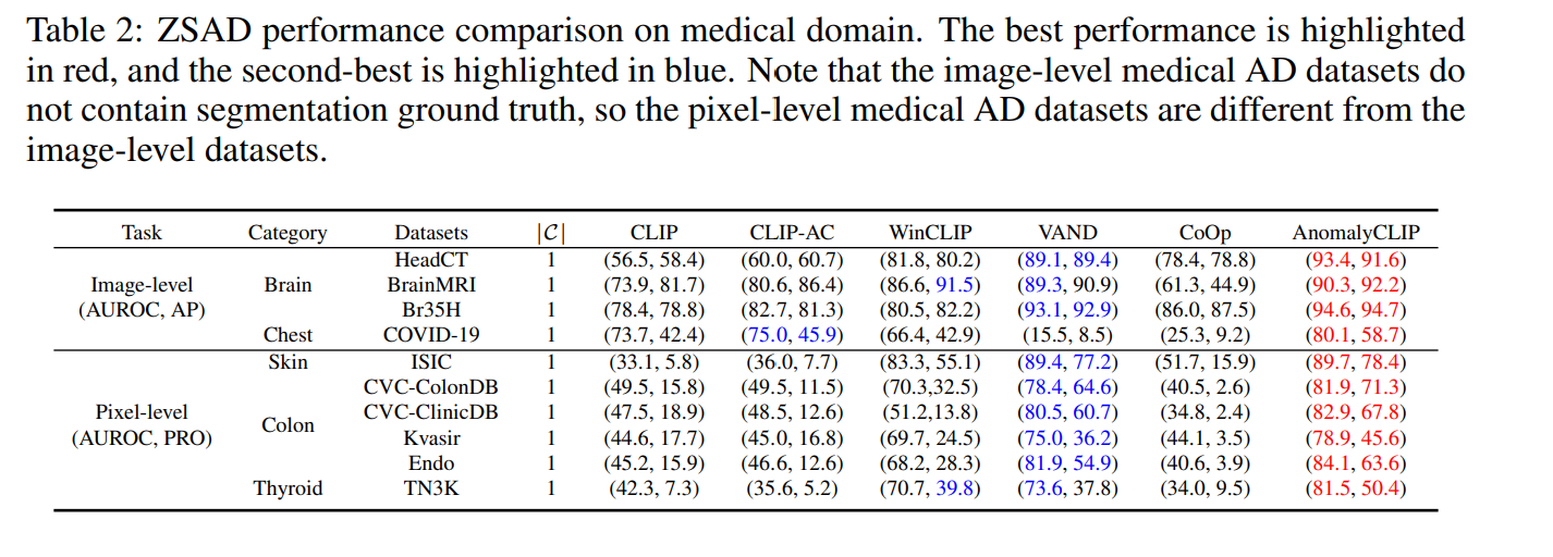 일반화 능력을 평가하기 위해 10개 의료 이미지 데이터셋에서 추가로 조사하였다. 이는 의료 영상 도메인에서 매우 다양한 객체 의미를 가진 데이터셋에서 AnomalyCLIP의 ZSAD 성능을 보여준다.