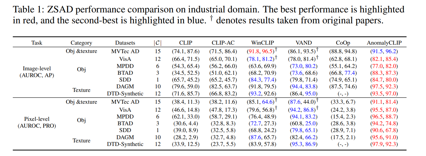 전체적으로 AnomalyCLIP과 VAND는 성능을 비교해본결과 AnomalyCLIP이 더 좋은 성능을 분류와 분할 모두에서 보였다.