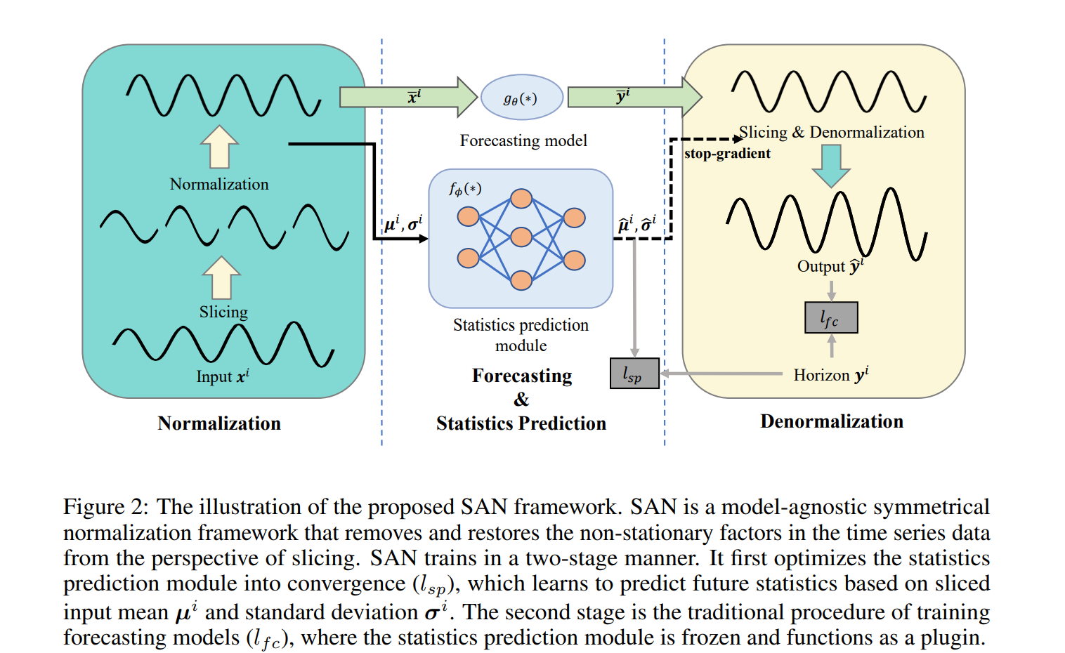 구체적으로, 인풋 시퀀스가 겹치지 않게 동일한 사이즈로 split 되고 그들의 통계를 통해 normalized 된다. 그리고 예측 모델에 들어간다. 또한 통계 예측 모듈을 사용하여 future slice에 대한 분포를 예측한다. 마지막으로, 예측모델에서 나온 아웃풋에 통계 비정상성 정보가 재복원된다. 슬라이스 레벨 특성을 모델링함으로써 SAN은 비정상성을 local region 에서 제거할 수 있게 된다. 게다가, 통계 예측 모듈이 독립적으로 통계 특성을 모델링하기 때문에 SAN은 더 정확한 통계를 adaptive한 denormalization을 통해 예측하게 된다.