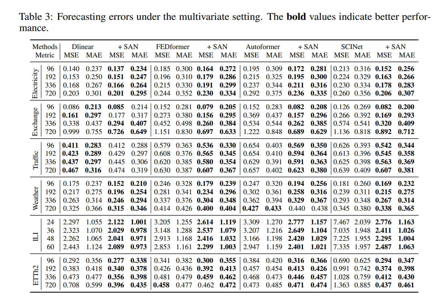 SAN이 모델에 상관없이 사용가능한 프레임워크이기 때문에 아무 예측 모델에 사용 가능하다. 따라서, DLinear, Autoformer, FEDformer, SCINet 에 사용되었다.