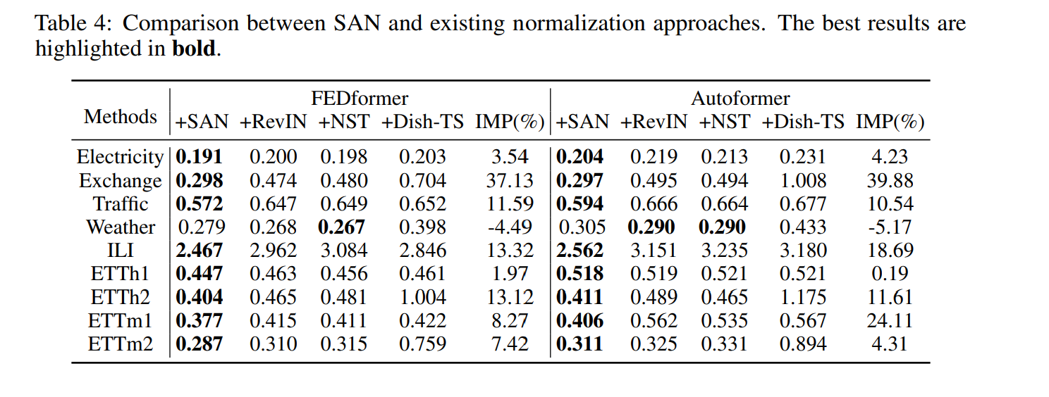 3. 충분한 실험을 9개의 실제 데이터셋을 통해 실험하였고, 결과는 SAN이; 다양한 메인스트림 예측 모델에 비해서 퍼포먼스를 높임을 보였다. 게다가, SAN과 SOTA 정규화 방법론을 비교하여 제안 방법론의 우수함을 입증하였다.